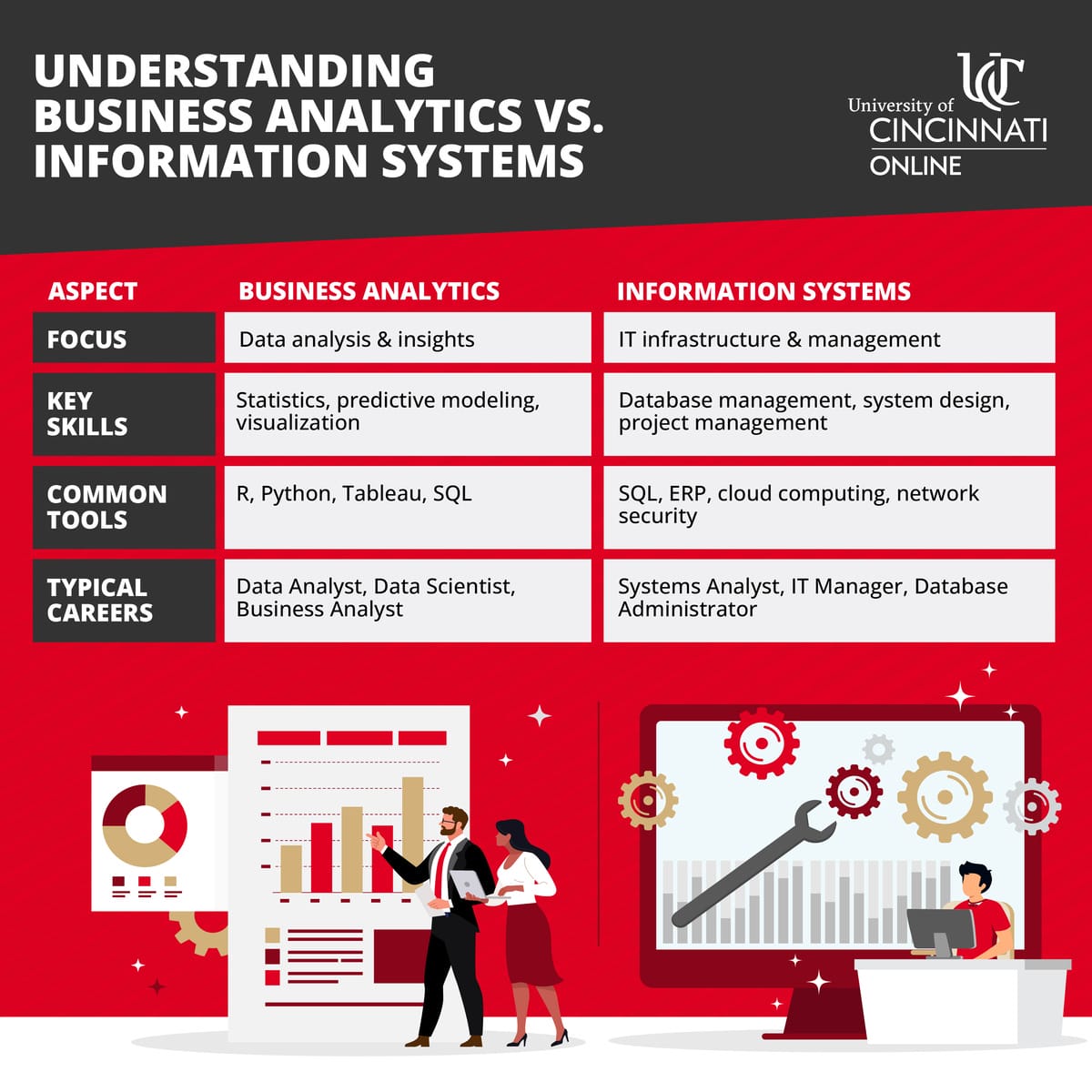 A master’s degree in business analytics prepares you for roles such as data analyst, business analyst, data scientist, and analytics consultant. A master’s degree in IS prepares you for roles like systems analyst, information manager, database administrator, and systems consultant.