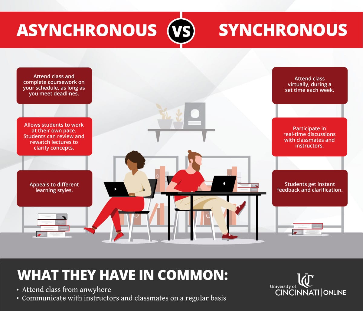 Now that you understand what an online program is and isn’t, we’ll explain the differences between asynchronous learning and synchronous learning, give you more information about each, and explain the benefits of both.