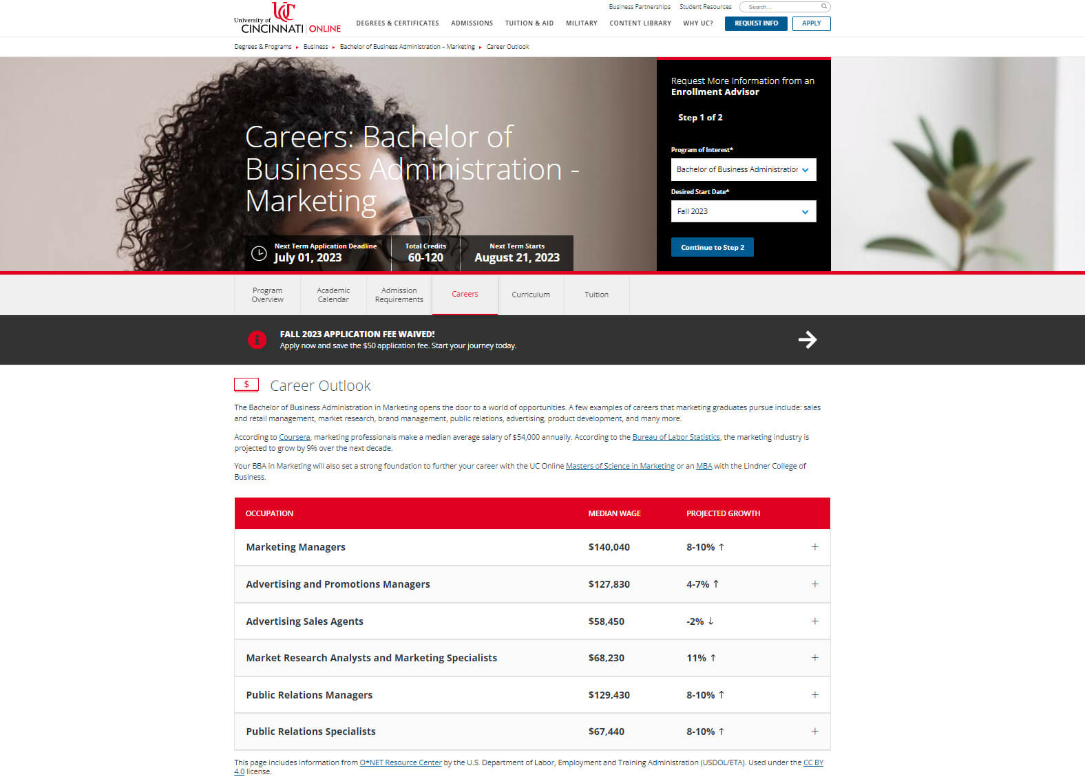 On every program page of UC Online’s website – we provide a careers tab that will give you information such as possible careers for that program, salary estimates and expectations, and other career-related information specifically for that degree. Please see the example below.