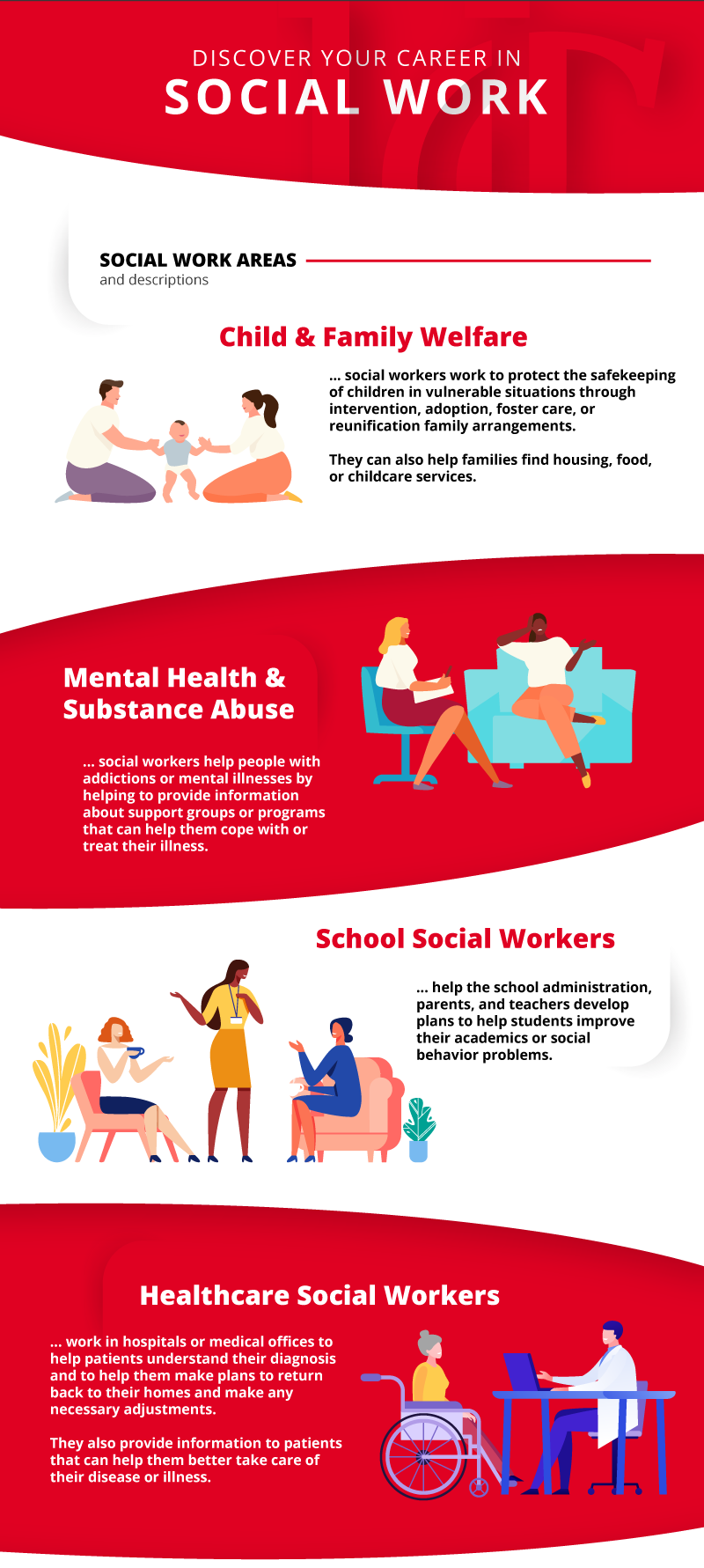 - Child and Family Welfare social workers work to protect the safekeeping of children in vulnerable situations through intervention, adoption, foster care, or reunification family arrangements. They can also help families find housing, food, or childcare services.