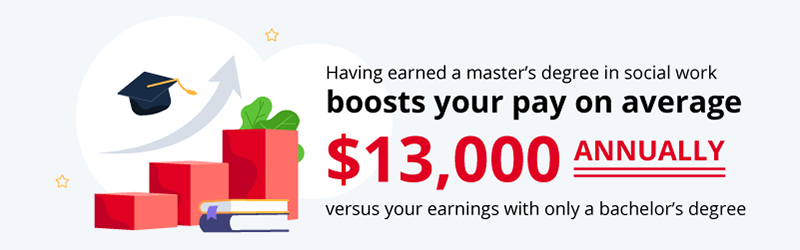 Difference in salary between a social worker with a bachelor's degree vs. a master's degree: (according to socialworkers.org) The job market for all licensed social workers is predicted to grow 16% overall in the next six years, with the most growth occurring in child, family, and school; healthcare and medical; and mental health and substance abuse positions. However, having earned a master's degree in social work boosts your pay on average $13,000 annually versus your earnings with only a bachelor's degree.