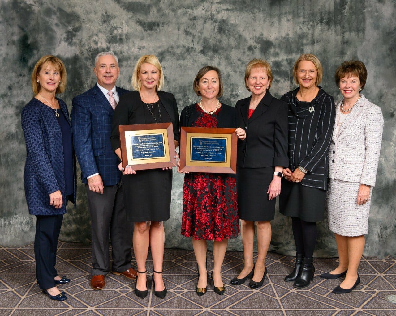 Barb Trautman of AACN stands with Tim McGowan and Megan Ulrich of Maple Knoll, Dean Greer Glazer, Debi Sampsel and Denise Gormley of the College of Nursing and Ann Cary of AACN to celebrate the Exemplary Academic-Practice Partnership Award. photo/ submitted   The College of Nursing was recently recognized by the American Association of Colleges of Nursing (AACN) for this collaboration with the Exemplary Academic-Practice Partnership Award. The award is presented annually to AACN member schools and their partners to recognize highly productive and model partnerships. The award was presented at the AACN 2019 Academic Nursing Leadership Conference in Washington, D.C., on Oct. 21. The college also received the Innovations in Professional Nursing Education Award, which recognizes the outstanding work of AACN member schools to reenvision traditional models for nursing education and lead program change.