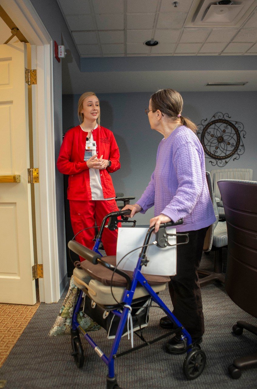 Nursing student Ashley Kocina talks with a resident of Maple Knoll Village. Photo credit: Joseph Fuqua II/UC Creative Services