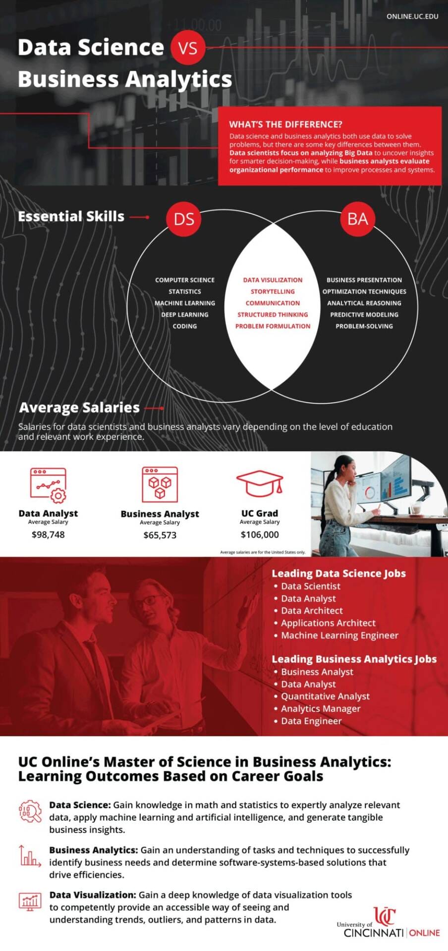 Business analytics and data science may have their differences, but they share the goal of using large amounts of data to understand information and solve problems. No matter which you decide is best for you, UC’s master’s program provides the expertise needed to successfully stand out from the competition and succeed in your role, regardless of location or scope. Ready to learn more? Explore our online program to discover how you can achieve your goals with an advanced degree from the University of Cincinnati Online; or take the first step in advancing your career by beginning your application today.
