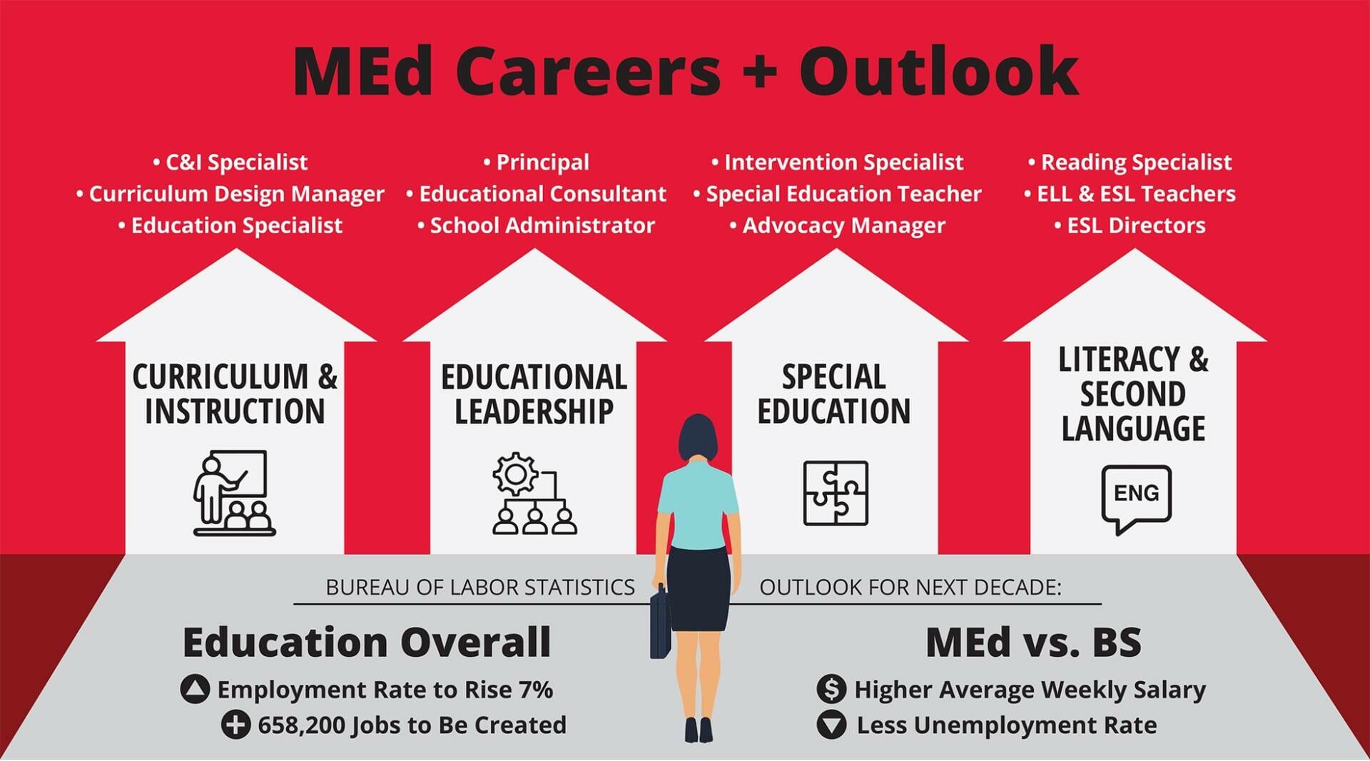 While many people pursuing a master’s degree in education also received a bachelor’s degree in the education field, that is not always the case. An example is how earning an undergraduate degree in Psychology, English, or Spanish can also be considered an asset before earning an M.Ed. in Literacy and Second Language Studies or an M.Ed. in Special Education. While a bachelor's degree in education is a great first step in your academic career, it is not the only way, especially for those who are looking to become an educator as their second or even third career. Is an M.Ed. in Literacy and Second Language Studies the right choice for you? This degree focuses on reading, writing, and speaking as language processes. After completing this degree program, students walk away with an in-depth knowledge of the social, cultural, linguistic, and institutional factors contributing to a learner’s ability to use reading, writing, and speaking in their first or second language. In addition, this degree path allows students to select the disciplinary concentration that aligns most with their goals. This degree might be right for you if you’ve already earned an undergraduate degree in Early Childhood Education, English, Spanish, Elementary Education, or Secondary education. In addition to earning your M.Ed. in Literacy and Second Language Studies, this program offers a certificate in PreK-12 reading instruction and a certificate in teaching English to speakers of other languages (TESOL). These certificates or concentrations allow students to narrow their coursework to tailor the educational experience. Is an M.Ed. in Educational Leadership the degree program for you? This degree is perfect for licensed educators looking to further develop their knowledge and skills to enhance learning and expand their earning potential through higher-level academic administration or leadership education roles. Individuals with that specialized background can come from almost any undergraduate degree program, including a bachelor’s in Early Childhood Education, Special Education, Elementary Education, and Middle Childhood Education. In addition, an M.Ed. in Educational Leadership offers leadership program concentrations in special education leadership for those who would like to focus on legal and ethical roles and responsibilities of a professional within the field of special education or principal leadership, for those who want to gain the tools to be a successful principle. Is an M.Ed. in Curriculum and Instruction the right program choice for you? This degree is perfect for teaching professionals who want to grow in their careers and make a change in the classroom. In addition to practicing teachers, this program is an excellent fit for anyone interested in planning, developing, implementing, and evaluating educational and instructional programs in various school and non-school settings. While earning this degree, students can choose a concentration in STEM education, gifted education, or teaching and learning general studies. By acquiring these certificates, students can focus on what they are passionate about within the broader curriculum and instruction coursework. Like most other M.Ed. programs, individuals can come from a wide range of educational backgrounds, but most earn a bachelor’s of education before applying for an M.Ed. in Curriculum and Instruction. Is an M.Ed. in Special Education the right degree program for you? People with diverse backgrounds may pursue a master’s degree in special education. While many come from early, elementary, or middle childhood education backgrounds, some may pursue this degree after earning a degree in Psychology or another similar program. No matter what your educational or career history looks like, this master’s degree program is perfect for individuals who are caring, compassionate, and looking to gain the knowledge and skills they need to help better the lives of individuals with disabilities. In addition to providing educators with a general skillset to help them achieve their goals, this degree program also offers a certification or concentration in transition to work endorsement, autism spectrum disorders, or special education leadership.